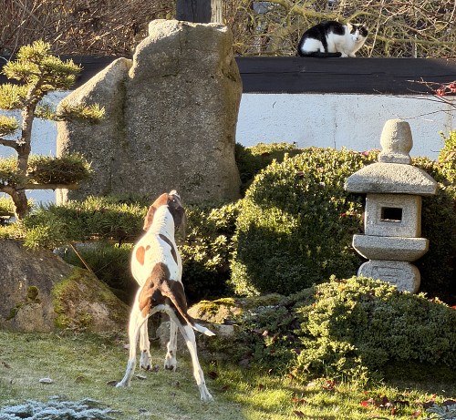 Odpoledne slyším Noru štěkat. Jdu se podívat. Na zdi sedí kočka a Noora stojí a štěká. Kočka si z toho nic nedělá. Zavolal jsem Gari. Ta se válela na svém křesílku v obýváku. Nějakou chvilku to trvalo, než jsem ji přesvědčil, že je venku kočička.