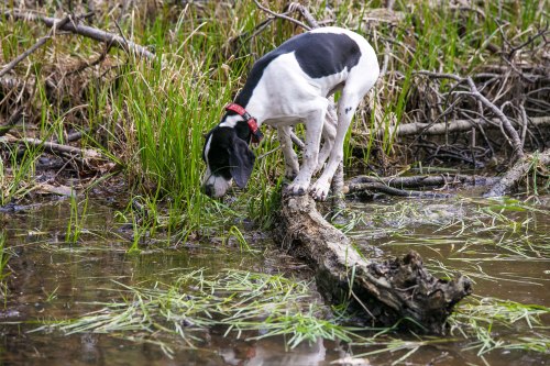 Voda, to mají pejskové rádi, pokud je dostatečně studená a špinavá. Strouha na okraji pole tyto parametry splňuje. Tůňka v lese taky – je to jakési bahniště s náznakem vody. Skvělá příležitost ke zprasení! Navíc v tom jsou popadané stromy. Po jejich kmenech se dá balancovat a pravděpodobnost pádu je vysoká. Nelze odolat.