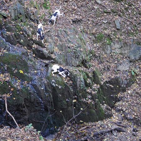 No a je tam takový malý vodopád – nicméně si myslím, že dvakrát třikrát do roka je docela mohutný, když se po vydatném dešti do něho soustředí voda z celé té velké pláně pod Ohrobcem, za zvolským fotbalovým hřištěm. Gari-lanovka vyběhla nahoru nad vodopád, pak ji napadlo se podívat, co tam je. Nejdřív capala,pak to začalo klouzat a nakonec nastal, jak to říci: garipád.