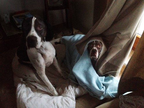 Naše pejskyně mají mnoho dobrých vlastností a k těm nejlepším patří jejich nechuť k brzkému vstávání. V létě je to mírně horší než v zimě, protože je brzy světlo. V tuto dobu je tma skoro do sedmi,takže nehrozí nebezpečí vpádu horkých čenichů pod peřinu. Pelechy jsou dva, jeden patří Noře, druhý Gari a tak tedy Gari leze do pelechu Noře a naopak. Z toho jsou někdy mrzutosti a pak dámy navrhnou řešení, že by s mohly přestěhovat do postele a že by pak byl pokoj.