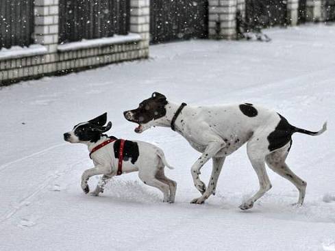 Nora je už otrlá sněhomilka, dalo by se říct sněžnice, kdežto Gari loví v paměti: kdepak já jsem to bílé viděla? Ale ano, viděla, ale byla tehdy malinká, pouhé štěňátko, když jsme ji přivezli z Měšínské hájovny a poprvé byla na procházce – 27. ledna tohoto roku. A už ve sněhu. Ano, hodně se změnilo, jak lze doložit srovnáním dvou fotek, jedna pořízena 27.1., druhá 2.12.2014.