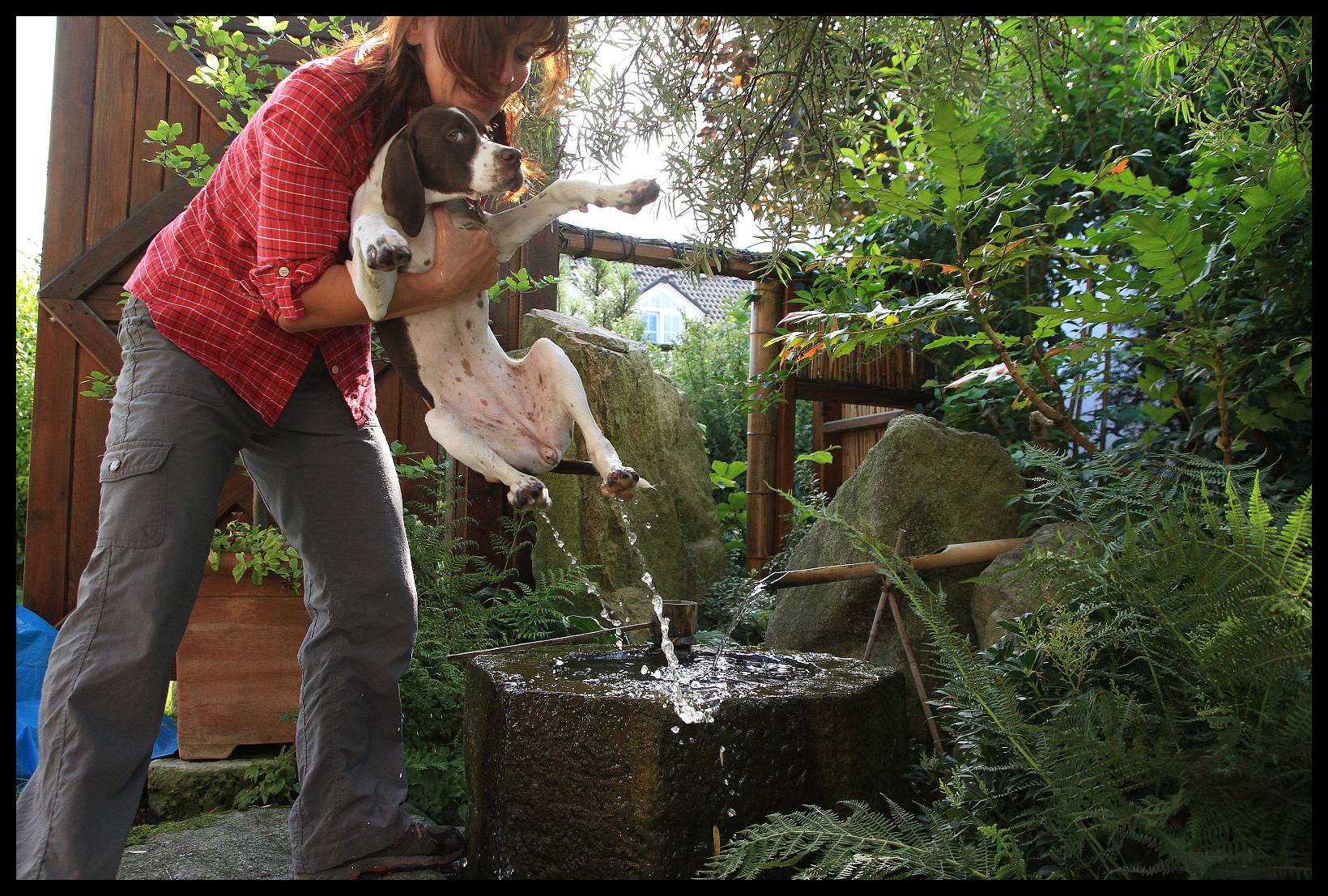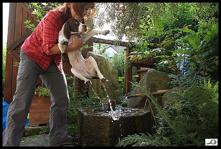 Praxe je taková, že fontánka tu je, teče do ní voda, slouží ptáčkům jako pítko a je to oblíbené zábavní místo naší Dodo, která se tu vždycky nerituálně zmáčí a nahází do ní kamínky. K očistě začala sloužit až teď, kdy máme Noru.