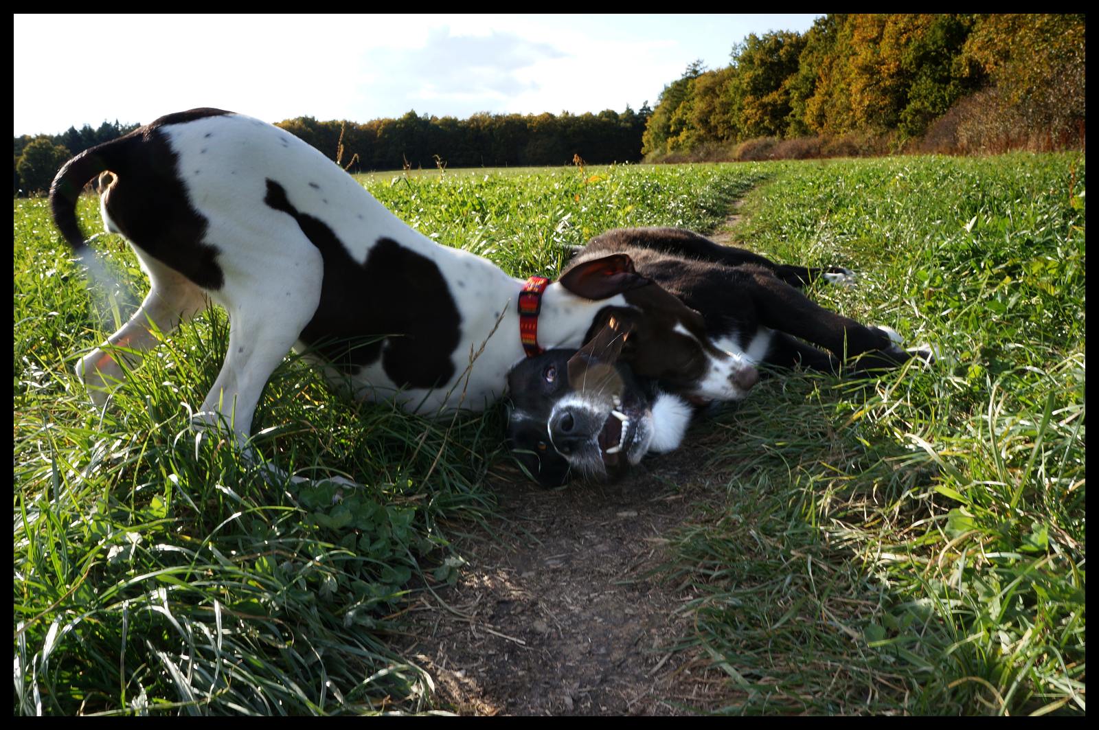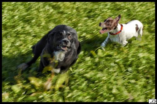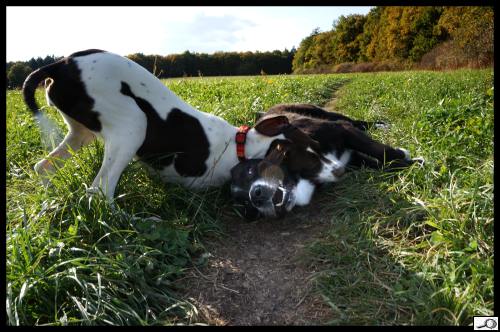 Nora nenarazí na hracího partnera často – naposledy to bylo v Průhonicích v parku a včera na louce pod lesem: Byl to pejsek milující honičky, jak nás ujistila jeho paní. Průběh honu obvyklý, přinejmenším ze začátku. Pejskové se honí kolem svých pánů. Ta louka má délku dva kilometry a šířku určitě jeden. Je možné po ní běžet až do Březové, kolem rybníka a vrátit se po její druhé straně. Dva kilometry volné plochy. Pejsky ale zajímá těch pár desítek metrů, něco jako kruh, a vy musíte stát uprostřed. Ten pejsek z toho byl upřímně rozradovaný a v jednu chvíli dal svou radost najevo tím, že mi v plné skočil na hruď. Já to ustál, na to jsem dost pyšný! No a po dvacátém, možná stém okruhu zpomaloval, až padl... Nora se pak vítězně rozhlížela: