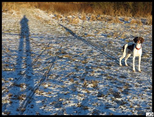Píšu ráno, ještě před procházkou s Norou. Z okna vidím venku sníh. Žádná tlustá vrstva, na Aljašce prý mají osm metrů, můj ty bože, i těch osmdesát centimetrů by dokázalo zamotat hlavu! A včera? Ráno překrásné sluníčko, ostré, nekompromisní – mohly se pořádat závody ve vrhání stínů. Jestlipak si je Nora vědomá, že vrhá stín? Snažil jsem se ty naše stíny nějak uspořádat, aby vyšly dobře na fotce. Velmi snaživě a důsledně moje snahy hatila. Když už jsem skoro tiskl spoušť, přešla tak, aby se stíny popletly. Nicméně to asi nebyl důkaz toho, že vnímá stíny, Je to jen projev pejskovské všetečnosti. V té souvislosti mě napadá – je snad opak všetečnosti netečnost? O tom budu přemýšlet, až s Norou vyrazím do bílého prostoru. Obávám se ale, že ty úvahy budou asi tak plodné, jako snaha o uspořádání závodů ve vrhání stínů.