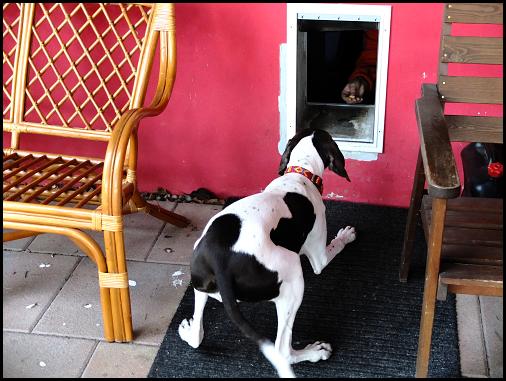 Snažili jsme se naučit Noru prolézt tou dírou. Pokušení to bylo obrovské, jak Nora dávala celou svou řečí těla najevo. Uvnitř cítili Fanánka a navíc zevnitř se nořila ruka s ňamítkem. Obrovská žádost, obrovská touha.