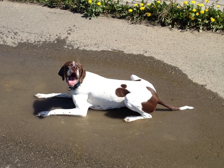 Pak jsem šel s Norou domů a bylo horko a Nora se chladila v louži a její snímek budiž dokladem toho, jak málo stačí k blaženosti: chleba, škvarky, absence cirkulárky a sekačky... a louže uprostřed silnice.