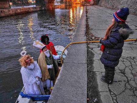 V podvečer jsem se s vnučkou vypravil na pražskou Kampu. Tam bývá pátého prosince Mikulášů větší počet než malý. Začalo to už po soumraku – po Vltavě, proti jejímu proudu, jel motorový člun. Už z dálky jsme viděl, že to není obyčejný člun a když přijel blíž, taky ano – uprostřed stál Mikuláš, na zádi seděl anděl a vpředu se choulil čert. Seběhl jsem s Dominikou tak dolů jak to šlo. Držela se velmi pevně za ruku. Bála se vvvvvelmi, není divu. Člun zastavil, posádka čekala, až se bude moci připojit k nějaké velké lodi a projede zdymadlem. No a následoval mikulášovský dialog na téma „byla jsi hodná“ a odříkání básničky.