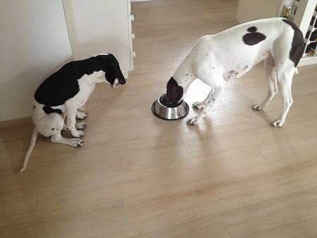 Nasypeme Noře. Gari zatím pořádá svoji misku v chambre separée. Nora se ale nevrhne na svoje granule, jen tu a tam nějakou uloupne a chroupe. Ona čeká, až Gari dožere, až ji vypustíme – a pak se teprve sama pustí do žrádla. Chce, aby Gari zpovzdálí hladově koukala a kvílela. Dokonce, když se stane, že Gari od její snídaně odejde, Nora krmení přeruší, jde za Gari, šťouchne do ní: pojď se podívat, jak pěkně žeru a nedám ti ani granuli! Ano, je to výchova granulí. Jenom nevím, k čemu ta výchova vede.