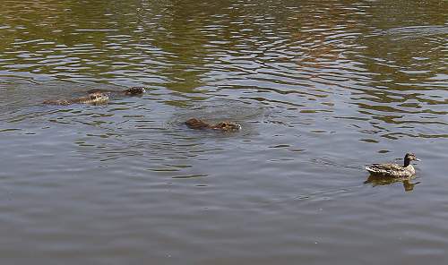 Včera po výletě jsme se zastavili v Kamenném Přívozu, aby se tam psíci zchladili v Sázavě. Psice vyhnaly kachny z jejich vyhřátých místeček na placatých kamenech a společně vzdorovaly výzvám, aby se odvážily skočit do vody – Nora už dříve plavala ve Vltavě a Gari je notorický Nebojsa, takže by se to měla snadno naučit. Vyhnané kachny se vracely v oblouku ke kamenům, aby se podívaly, zda ty flekaté šelmy jsou opravdu tak strašné, jak se to prve zdálo. Vracely se kachny, psice velmi zpozorněly, ale... co to? V závěsu za kachnami se táhla trojice nutrií. Začíná jich být plno, jsou vídány v Brandejse i v Davli, a to jen cituji místa, kde jsem je spatřil já. No a už jsou i v Kamenném Přívozu. Pro Gari s Norou je to ale novinka. Prapodivná novinka. Jen považte, kachna a má místo zobáku čumák a fousy a k dovršení všeho, má i uši! Kdyby gari s Norou věděly, že tyhle kachny mají čtyři nohy a ocas, možná by to s nimi seklo rovnou do vody. ![]()