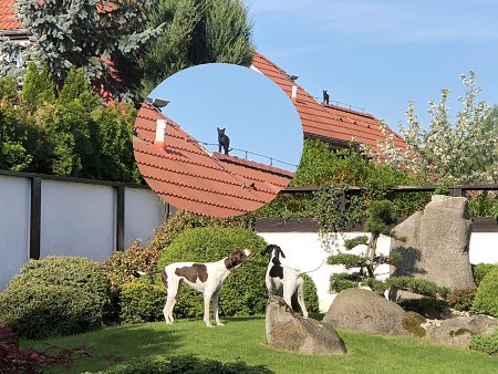 Kočky rády chodí po střeše a naši pejskové nesnášejí kočky v jakékoli jejich podobě, najmě pak kočky na střeše. To je čistý střet zájmů. Stačí aby se kočka na sousedovic střeše objevila a už se celý náš dům otřásá řevem a je třeba naše Krakeny vypustit. Nora vždycky běží vlevo od jezírka, Gari vpravo a pak se potkají v rohu zahrady a ječí na kočku.
