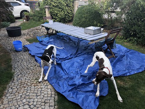 Nora chce pomáhat, to znamená, že si lehne na plachtu, pokud možno tam, kam bude kapat barva. To je skvělá perspektiva i pro Gari. Plachta je dost veliká na to, aby se na ni mohly uvelebit obě a nechat se pokapat, ale znáte to: Nora trvá na tom, že měla ten nápad první a ať se Gari jde nechat pokapat jinam, kdežto Gari je toho názoru, že právo býti pokapán patří k základním a nezadatelným psím právům a chce je hájit důsledně a energicky.