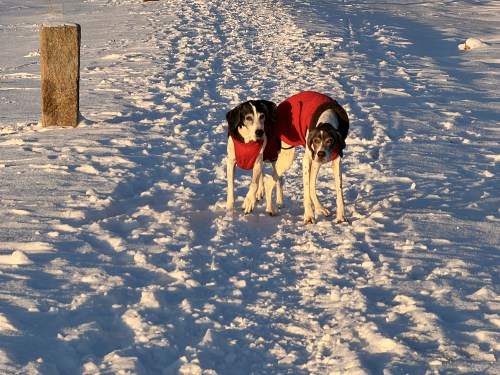 Měl jsem tu docela dlouhou pauzu. Gari a Nora jsou stařenky a už s nimi není taková llegrace jako dřív. Navíc se zdálo, že povídání o pejscích nikomu nechybí. Ale přece jen mi to vrtá v hlavě… píšu o pejskách od roku 1996 a jestli dobře počítám, v dubnu to bude třicet let! Vystřídali se za tu dobu pejskové… začalo to vlčákem Gordonem, pak přišel rotvajler Bart, s Ljubou vstoupila do děje Iriska a když umřela, je tu Gari s Norou. Té první je 13, druhé 15. Násobte sedmi a nebudete věřit, že je to možný… No tak jo, budu pokračovat. Pro dnešek je to fotka… dokud byl u nás ještě sníh. Stařenky nosí kabátky!